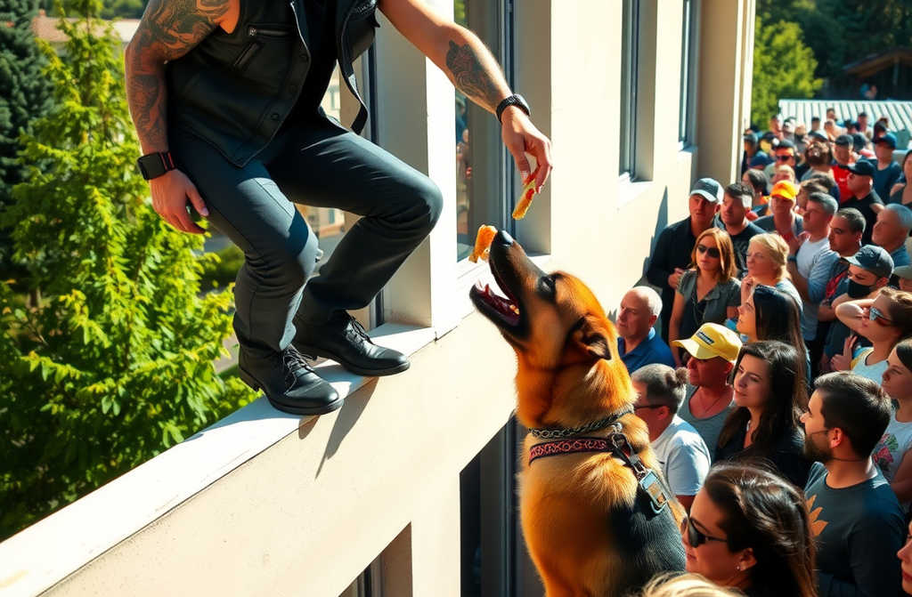 Eine Menge sammelte sich. Nachbarn. Passanten. Alle sahen zu, wie dieser Biker einen Hund fütterte – drei Stockwerke über dem Boden.