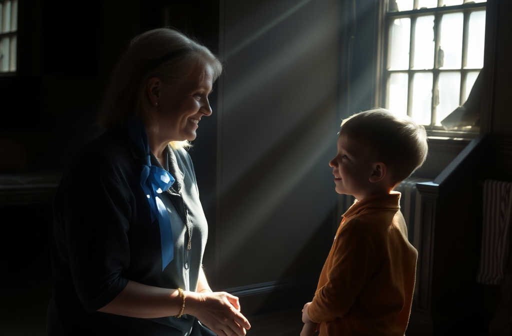 Następnego ranka obudziła się przed wszystkimi. Niebo było jeszcze szare. Zapach kawy docierał z kuchni. Włożyła prosty uniform, poprawiła niebieską wstążkę i zeszła na dół pewnymi krokami. W jadalni chłopcy stali nieruchomo przed talerzami, jakby czekali na rozkaz, który nigdy nie nadejdzie.