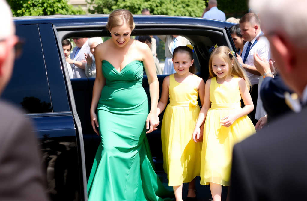 Najpierw wysiadły trzy dziewczynki w żółtych sukienkach, trzymające się za ręce. Ich loki podskakiwały, gdy szły po czerwonym dywanie. Za nimi wyszła Ania, elegancka w szmaragdowej sukni.