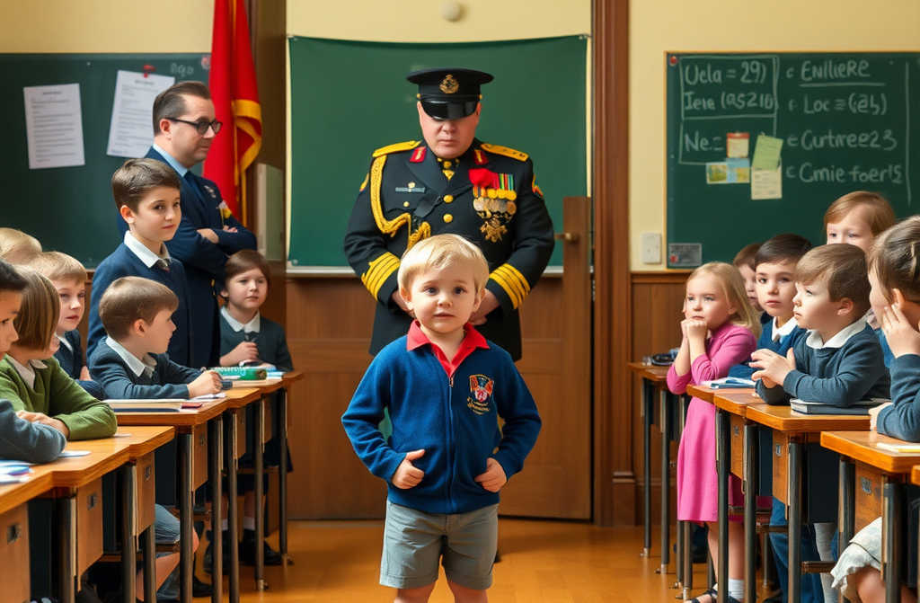Uczniowie ustawili się w rzędzie po przerwie, wciąż rozmawiając głośno. Nagle korytarz ogarnęła cisza. Rozległ się dźwięk ciężkich, miarowych kroków zbliżających się do klasy. Wszystkie głowy odwróciły się w stronę drzwi, przez które wszedł wysoki mężczyzna w mundurze wojskowym z orderami na piersi. Jego medaliki lśniły w świetle. Postawą emanował spokojnym autorytetem.