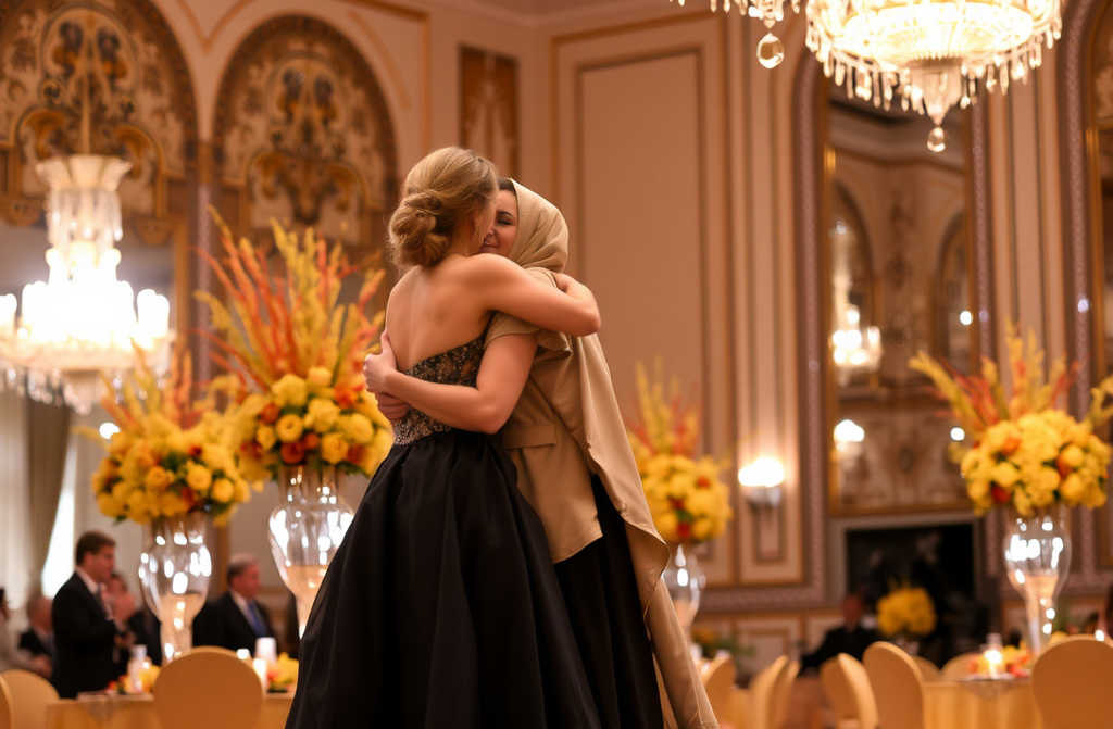 Der Ballsaal strahlte in hellem Glanz, erfüllt vom Licht kristallener Kronleuchter und geschmückt mit weißen und goldenen Blumen. Es war ein festlicher Abend, voller bedeutender Gäste und aufmerksamer Journalisten, die kein Detail verpassten. In der Mitte des Raumes schritt die Milliardärin Annette mit anmutiger Eleganz, gekleidet in einem langen blauen Kleid, das ihre noble Haltung unterstrich. Um sie herum klangen Gelächter, Gläser klirrten, Hände applaudierten. Alles schien perfekt, bis plötzlich etwas ihre Ruhe durchbrach. Zwischen den Bediensteten, die Sekt und Canapés servierten, fiel ihr eine schlicht gekleidete Frau in schwarzer Uniform und weißer Schürze auf.