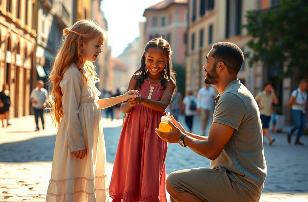 Aan de overkant van het plein stond een meisje van haar leeftijd. Haar donkere huid glom van het zweet, haar kleren waren gescheurd en vuil, haar blote voeten stoffig van de straat. In haar handen hield ze een klein glazen flesje, gevuld met dikke, gouden vloeistof. Ondanks haar armoede straalde er een vastberadenheid uit haar ogen, alsof ze een schat bewaakte.