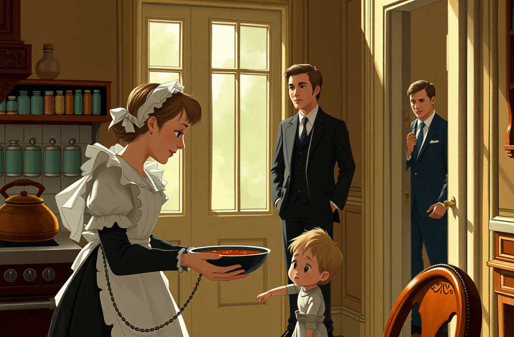 Echo jego wypolerowanych butów odbijające się od marmurowej posadzki stawało się coraz głośniejsze. Wszedł do kuchni, spodziewając się ciszy — zamiast tego zobaczył Zofię, sztywno stojącą, i obdartego chłopca pochłaniającego jedzenie z porcelanowej miski.