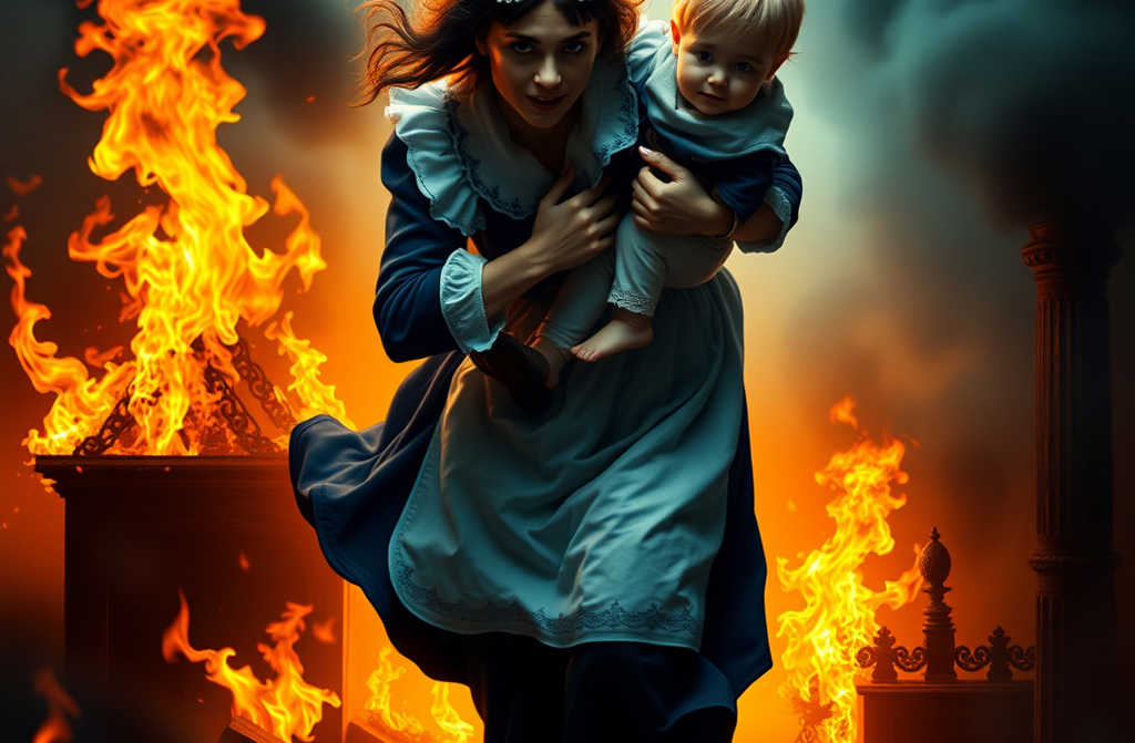 Ein brennender Balken krachte hinter ihr herab, fast schnitt er ihr den Fluchtweg ab. Ihr Arm war verbrannt, Schmerzen durchzogen ihren Körper. Trotzdem blieb sie nicht stehen. Schritt für Schritt, zitternd, schützte sie beide Jungen mit ihrem eigenen Leib.