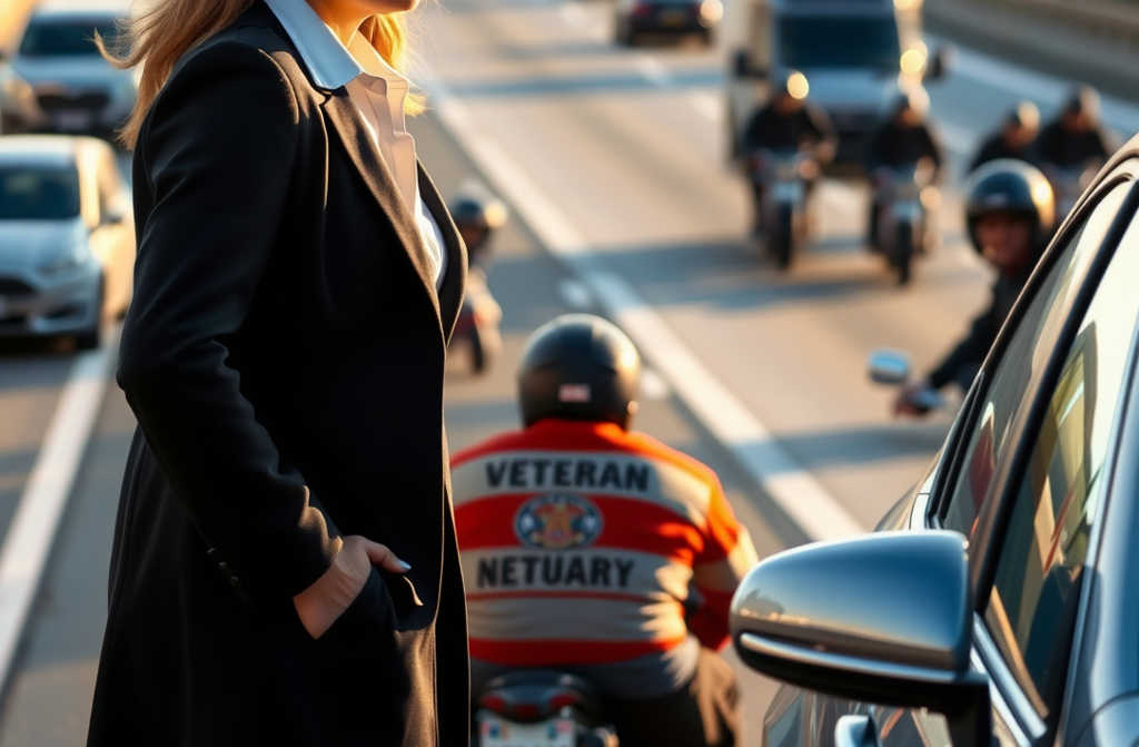 Ik stormde uit mijn auto, richting ze. “Wat is er mis met jullie? Dit is illegaal! Je kunt niet zomaar een snelweg blokkeren! Mensen hebben haast!” De dichtstbijzijnde motorrijder, een brede man met een grijze baard, keek me niet eens aan. “Mevrouw, ga alstublieft terug naar uw auto.”