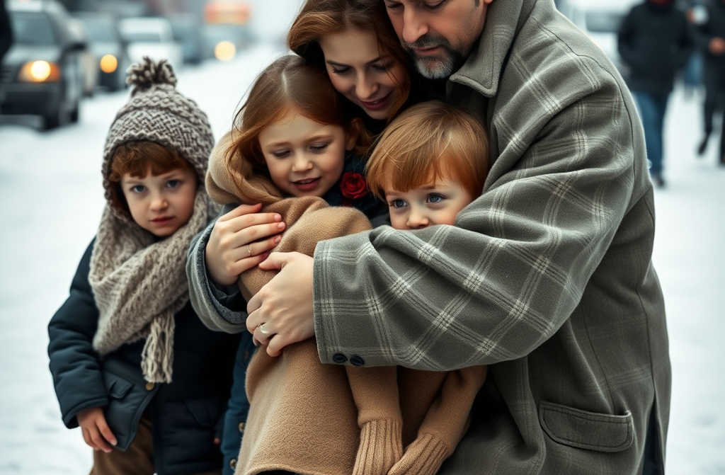 Tegen een oude bakstenen muur zat een vrouw gehuld in een versleten jas die amper als kleding kon tellen, haar haar verward door de koude wind en uitzichtloosheid. Naast haar kropen drie kinderen dicht tegen elkaar aan, kleine lijfjes samengepakt voor warmte, wangen rood van de vrieskou, ogen te wijs voor hun leeftijd. Ze hield een kartonnen bord vast met wankele letters: