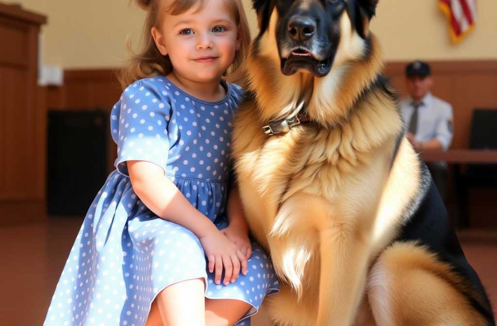 Achter haar klonk het zachte geluid van nagels op linoleum: Schaduw. De rechtzaal ademde collectief uit toen de grote herder binnenkwam. Kalm en statig, zijn bruine ogen scanden de ruimte—alert maar rustig—zijn politie-uitgeruste therapieharnas stevig om zijn borst. Schaduw was getraind om jonge slachtoffers te troosten tijdens verhoren, maar niemand wist hoe cruciaal zijn rol zou worden.