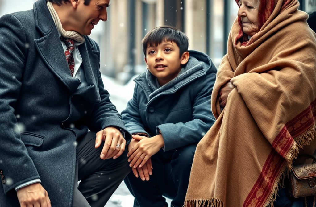Hanna Nowak, siedemdziesięciotrzyletnia elegancka wdowa po wielkim Józefie Nowaku, siedziała na mokrym chodniku, drżąc. Obok niej, prawie podtrzymując ją, stał młody mężczyzna z zaniedbaną brodą i ciemnymi oczami, owinięty w warstwy brudnych ubrań. Narzucił jej swój własny koc na ramiona i osłaniał ją ciałem przed lodowatym wiatrem.