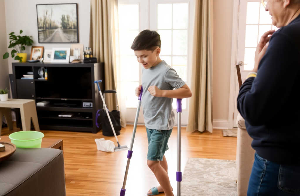 Het was wat er naast haar gebeurde. Mijn zoontje, Lars, pas vier jaar oud, stond rechtop met zijn kleine paarse krukken, een theedoek in zijn handje, en probeerde Britt te helpen met opruimen.