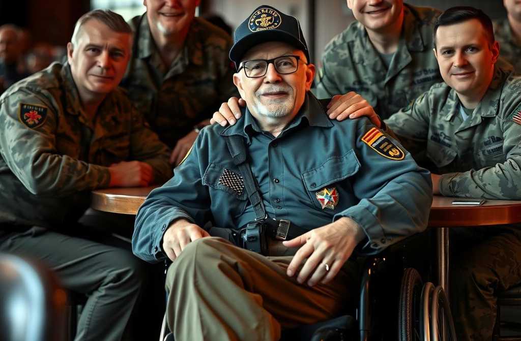 „Master Chief“, sagte er leise. „Ich bin im Café Blau. Hier belästigen drei Männer eine Veteranin. Sie hat ein Trident am Rollstuhl – ein echtes.“