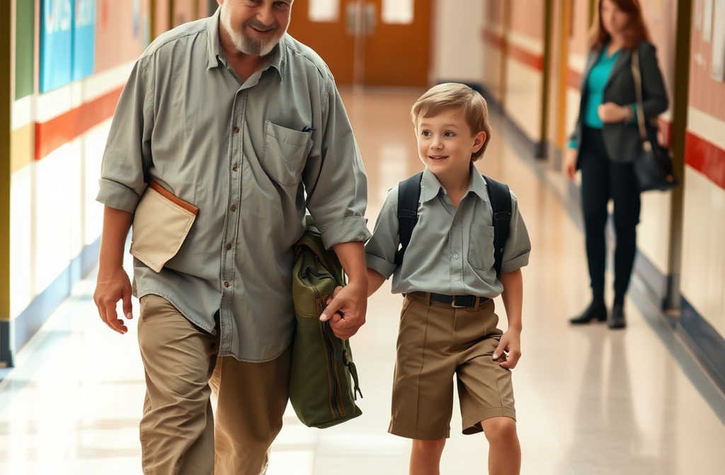 Dziecko miało idealnie wyprasowany mundurek, białą koszulę, granatowe spodnie, wypolerowane buty i plecak, który wciąż pachniał nowością. Włosy miał starannie rozczesane, postawę prostą. Wyglądał dokładnie tak jak każdy inny uczeń w budynku—z wyjątkiem tego, jak jego mała dłoń kurczowo ściskała palce żebraka, jakby bał się puścić.