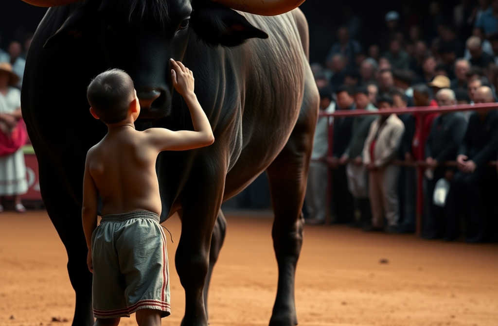 Chłopiec zrobił jeszcze jeden krok i dotknął jego czoła. Byk ciężko wypuścił powietrze… i opuścił głowę. Na trybunach nikt nie mógł uwierzyć w to, co się dzieje.