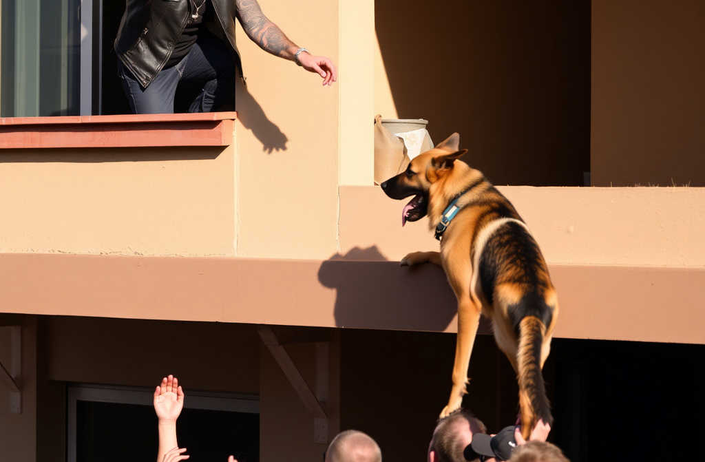 Dotarł na trzecią kondygnację. Podciągnął się na balustradę. Pieszczak stał tam, szczekając jak oszalały. Motocyklista wyciągnął dłoń powoli. „Spokojnie, kolego. Spokojnie. Jestem tu, żeby pomóc.” Jego głos był łagodny. Cichy. Zupełnie niepasujący do przerażającego wyglądu.