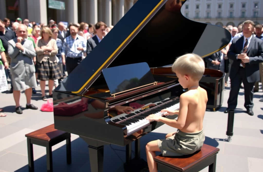 Wszystkie spojrzenia wbiły się w bosonogiego chłopca stojącego przy fortepianie Steinwaya wartym 800 tysięcy złotych. Maciek miał 11 lat, brudne ręce od noszenia tac i połatane ubrania, które zeszyła mu matka. Właśnie popełnił błąd – dotknął klawisza najdroższego fortepianu na przyjęciu, a teraz najbardziej bezwzględny biznesmen w mieście zrobił z niego publiczne widowisko.