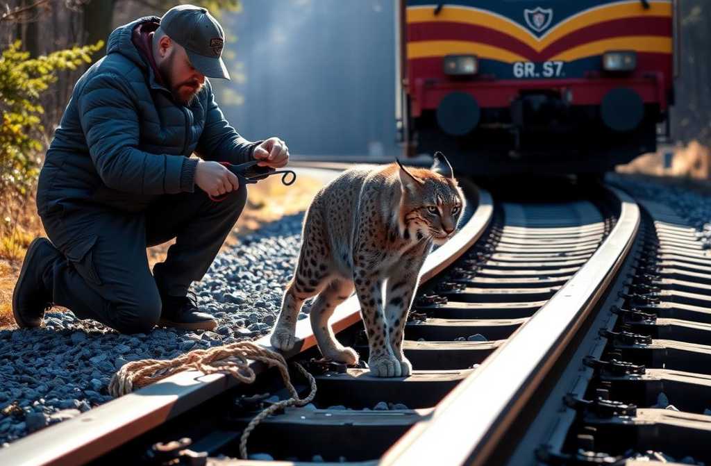 Tuż obok torów zatrzymał się czerwony SUV. Wyskoczył z niego mężczyzna – postawny, zdecydowany, z nożem w dłoni. Bez chwili namysłu rzucił się w stronę zwierzęcia.