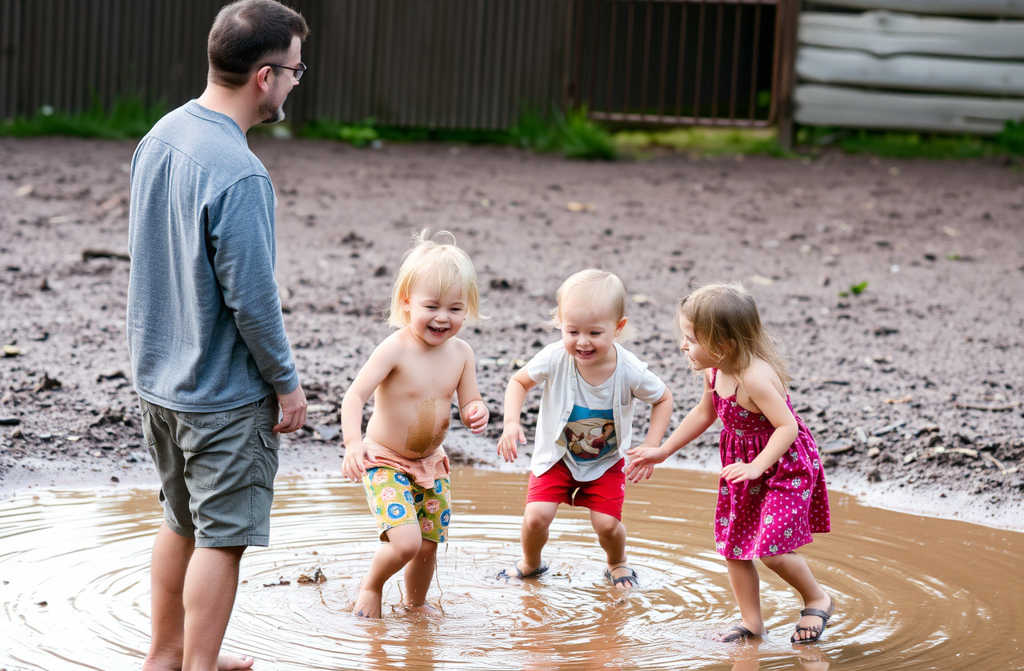 Jego troje dzieci było całe w błocie, brodząc w wielkiej kałuży, która pochłonęła część jego nieskazitelnego trawnika. Woda rozpryskiwała się na przyciętych żywopłotach i kamiennych ścieżkach.